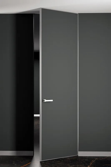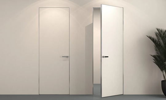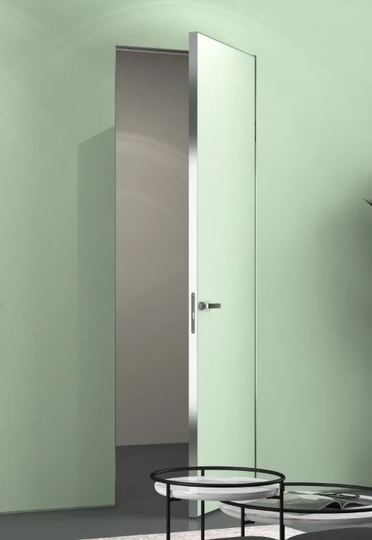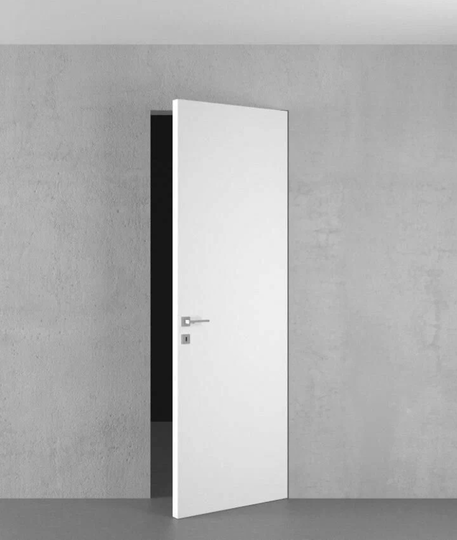 Скрытая дверь Инвизибл под покраску в скрытом коробе. Грунтованное покрытие для дальнейшего декорирования краской. Допустимо использование в помещениях с повышенной влажностью. Безопасно для здоровья и окружающей среды. Можно красить или клеить обои. Устанавливается вровень со стеной.
