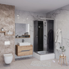 ролики, центральная стойка, латунный 1-режимный смеситель, сифон с гофрой, экран съемный, сиденье на поддоне, стеклянная полка