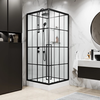 поддон 15 см, раздвижные двери, задняя стенка белая, металлические ролики, латунный 2-х режимный смеситель, лейка, 2 стеклянные полочки, металлические ручки, сифон с гидрозатвором, экран несъемный