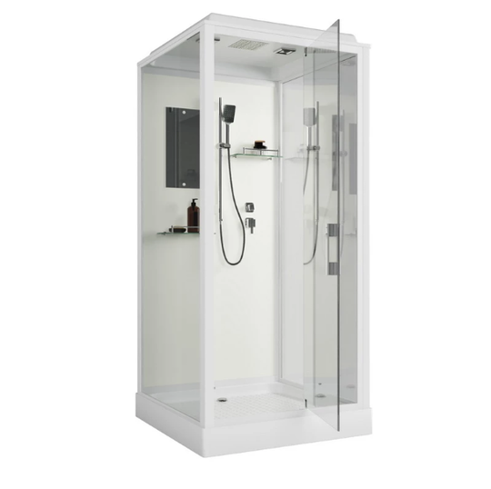поддон 15 см, распашная дверь, металлические петли, задняя стенка белая, латунный 2-х режимный смеситель, 2-х режимная лейка, штанга, 2 стеклянные полочки, пластиковая ручка, зеркало, вентиляционные решетки, сифон с гидрозатвором, экран несъемный