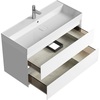 Тумба Aqwella Geometria 100 оснащена двумя выдвижными ящиками на направляющих скрытого монтажа, что обеспечивает плавное скольжение и мягкое закрывание. Фасады и боковины с обработкой торцов под углом 45 градусов создают лаконичность и изящный, почти монолитный силуэт в закрытом состоянии. Все грани имеют округлую фрезеровку, обеспечивая приятные тактильные ощущения при открывании. Внутри ящиков - отделка под светлый камень, боковины выполнены из толстого тонированного стекла, что добавляет коллекции элегантности.