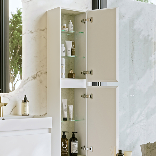 Пенал Aqwella Geometria 35 оснащен двумя дверцами на петлях с мягким закрыванием, внутри расположены полочки. Фасады и боковины с обработкой торцов под углом 45 градусов создают лаконичность и изящный, почти монолитный силуэт в закрытом состоянии. Все грани имеют округлую фрезеровку, обеспечивая приятные тактильные ощущения при открывании. Внутри - отделка под светлый камень.