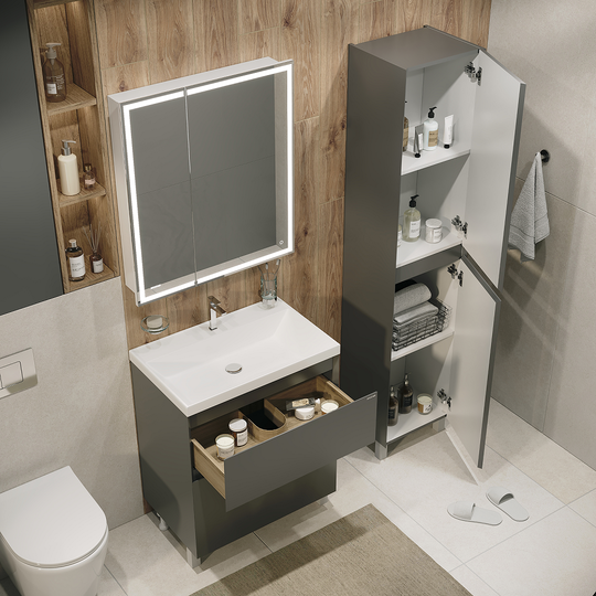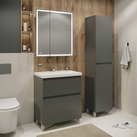 Пенал Меркадо 40 - компактное и функциональное решение для хранения в ванной комнате. Корпус и фасады выполнены из МДФ в матовой краске в цвете графит. Фасады с точным запилом под 45° на торцах, что исключает видимую кромку и позволяет обходиться без ручек, создавая аккуратный и минималистичный дизайн. Пенал оснащён тремя полками для удобного хранения и петлями с доводчиком, обеспечивающими плавное и бесшумное закрывание дверцы. Модель установлена на хромированные ножки высотой 10 см, а для надёжного крепления предусмотрены подвесы в комплекте.