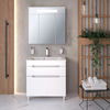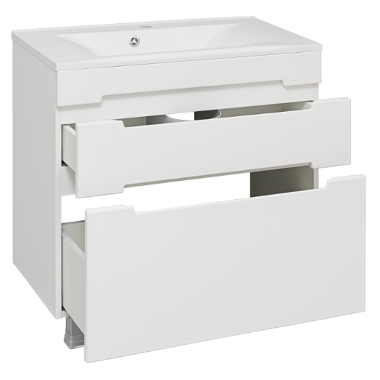 Тумба Olivia 80 оснащена двумя выдвижными ящиками на шариковых направляющих скрытого монтажа с доводчиками. Ящики легко открываются благодаря удобным вырезам на фасаде.