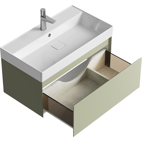 Тумба Aqwella Geometria 80 оснащена одним выдвижным ящиком на направляющих скрытого монтажа, что обеспечивает плавное скольжение и мягкое закрывание. Фасады и боковины с обработкой торцов под углом 45 градусов создают лаконичность и изящный, почти монолитный силуэт в закрытом состоянии. Все грани имеют округлую фрезеровку, обеспечивая приятные тактильные ощущения при открывании. Внутри ящиков - отделка под светлый камень, боковины выполнены из толстого тонированного стекла, что добавляет коллекции элегантности.