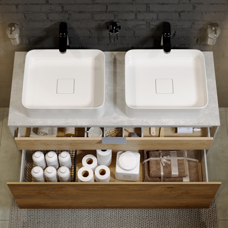 Тумба Mobi 120 оснащена двумя ящиками: основным и внутренним, скрытым за фасадом. Направляющие ящиков обеспечивают плавное и мягкое закрывание. Внутренний ящик тумб укомплектован пластиковым разделителем для хранения различных мелочей. Внутренняя отделка ящиков комбинированная: боковины – цвет бетон светлый, дно – дуб балтийский. В комплект тумбы Mobi входит специальный сифон, позволяющий экономить пространство мебели. Фасады, боковины и столешницы из МДФ толщиной всего 10 мм. Подходит любой наставной умывальник. При этом умывальник может устанавливаться в любом месте, а не только центру. На данную тумбу также можно установить один умывальник. Коллекция оснащена итальянскими навесами Camar, которые выдерживают нагрузку до 200 кг.
