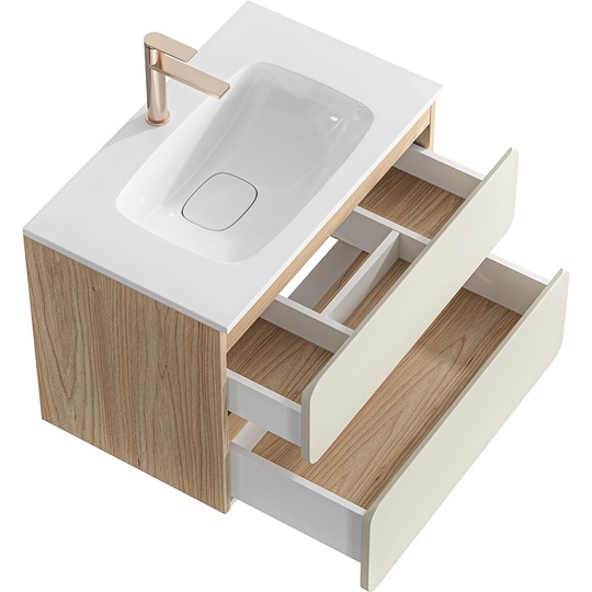 Созданная в стиле софт-минимализма, коллекция Vento отличается мягкой геометрией и визуальной тишиной. Скругленные фасады окрашены матовой краской, также они выполняют функцию скрытых ручек. Древесный корпус из ЛДСП в оттенке светлой акации. Тумбы Vento оснащены умывальниками Malaga из литьевого мрамора, сочетающими четкую геометрию с мягкой пластикой линий. Глубокая практичная чаша обеспечивает комфортность в использовании, а декоративная заглушка в сливной зоне сохраняет чистоту поверхности и архитектурную строгость. Внутреннее пространство продумано до мелочей: дно ящиков выполнено в цвет корпуса, а в верхний ящик установлена система организации внутреннего пространства в виде трех перегородок из ЛДСП.