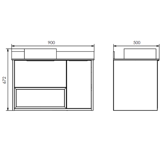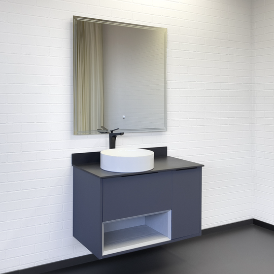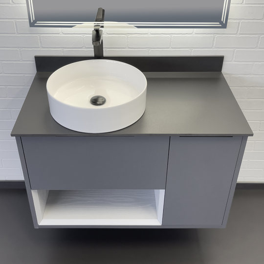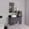Подвесная тумба Comforty Джанкой 90 оснащена одним ящиком и створкой, оборудованными системой плавного закрывания. Предусмотрено пространство для открытого хранения. На фасадах тумбы черные матовые алюминиевые ручки. Круглая раковина-чаша установлена на черную столешницу из керамогранита. В комплекте также пристенный плинтус. Ниша открытого хранения сделана из МДФ в пленке серого цвета с текстурой дерева. Торцы вставки спилены под углом.
