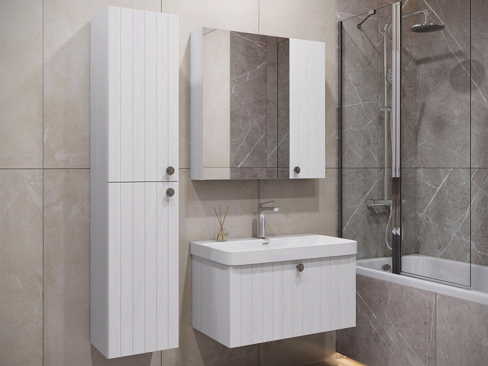 Подвесная тумба с одним широким выдвижным ящиком, оснащенным направляющими Hettich с системой плавного закрывания. Фасад тумбы изготовлен из МДФ, фрезерован вертикальным узором и и облицован пленкой имитирующей текстуру дерева ясень беленый. Внутренние детали из влагостойкого ЛДСП. Ручка из цинкового сплава в цвете состаренный черненый. Тумба подготовлена для подключения водоснабжения снизу и сзади.