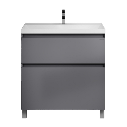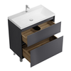 Тумба Меркадо 80 - стильное и функциональное решение для интерьеров в скандинавском и современном стиле. Корпус и фасады выполнены из МДФ в графитовой матовой краске. Фасады с точным запилом под 45° на торцах, что исключает видимую кромку и позволяет обходиться без ручек, создавая лаконичный и минималистичный дизайн. Два вместительных ящика изготовлены из ЛДСП «Дуб Эльвезия» и оснащены направляющими скрытого монтажа с доводчиком, обеспечивающими плавное и бесшумное закрывание. Тумба установлена на хромированные ножки высотой 10 см, а для надежного крепления предусмотрены подвесы в комплекте.