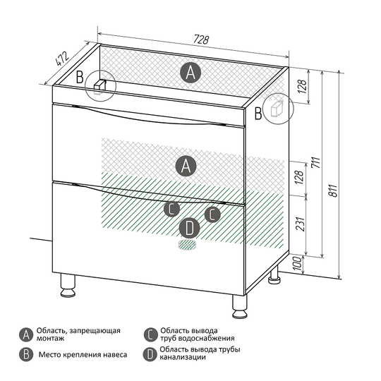 Два вместительных ящика оснащены скрытыми направляющими с доводчиком и удобными интегрированными ручками с плавными линиями. В комплект входят хромированные ножки высотой 10 см.
