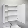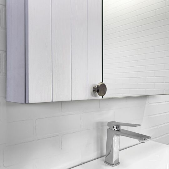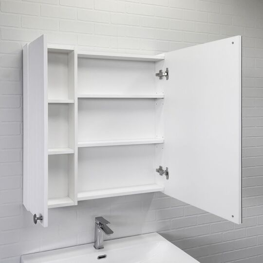 Высококачественное зеркальное полотно с амальгамой на основе серебра. Створки оснащены петлями с плавным закрыванием. Корпус и фасад зеркального шкафа выполнен из МДФ и облицован пленкой имитирующей текстуру натурального дерева ясень беленый. Открытие створки с мебельным фасадом производится с помощью ручки цвета черненый состаренный цинк. За створками по две горизонтальные полки из влагостойкого ЛДСП. Петли у створок снаружи. Зеркало-шкаф универсально - может быть подвешено в правом и левом варианте.